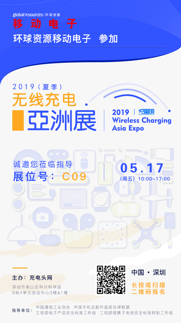 環球資源Global Sources將在5月17日出席參加:2019(夏季)無線充電亞洲展,展臺設在C09,歡迎大家前來咨詢!