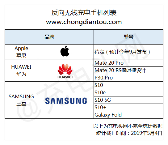 目前市面反向無線充電手機,涵蓋3大手機品牌8款機型:三星S10系列、Galaxy Fold、華為Mate 20 Pro、華為P30 Pro等。