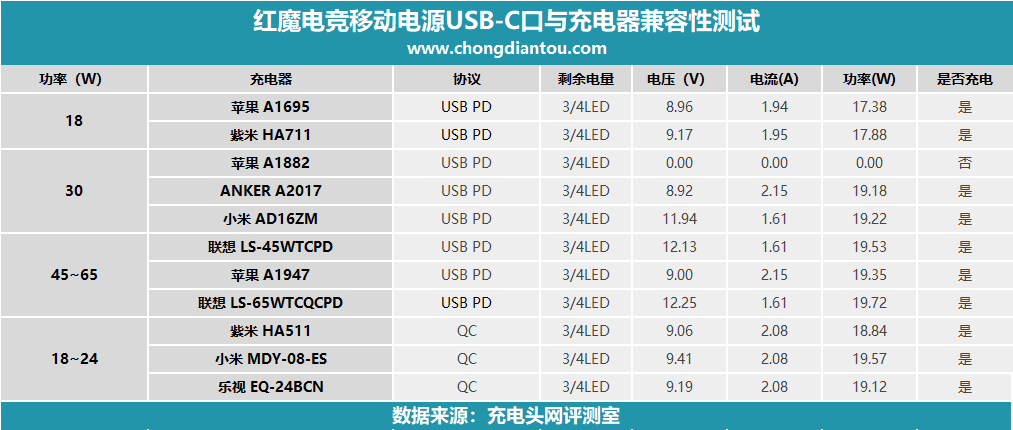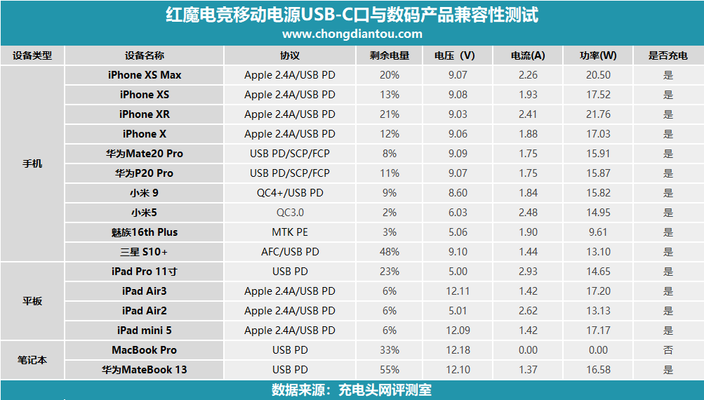 紅魔電競(jìng)移動(dòng)電源USB-C口兼容性在給手機(jī)、平板充電時(shí)表現(xiàn)不錯(cuò),均能為其充電;另外除魅族16th Plus之外,其余手機(jī)、平板設(shè)備均握手相對(duì)應(yīng)快充協(xié)議充電,這也表面該移動(dòng)電源USB-C口不支持PE快充;而對(duì)于筆記電腦的兼容性則出現(xiàn)有不能充電的情況,兼容性欠佳。