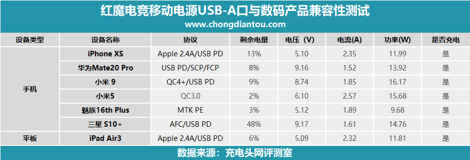 紅魔電競(jìng)移動(dòng)電源USB-A口兼容性表現(xiàn)不錯(cuò),除了魅族16th Plus外均能握手相對(duì)應(yīng)協(xié)議充電。