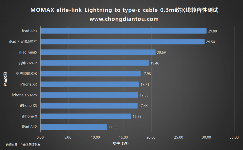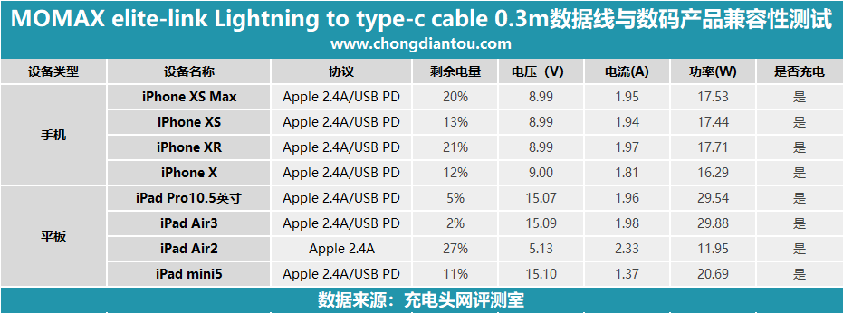 兼容性測試中,使用MOMAX elite-link Lightning to type-c cable 0.3m數據線+PD充電器測試了市面上一些支持PD快充且為Lightning接口的數碼產品設備,兼容性良好,均能開啟PD快充。如果你經常外出,需要一根結實耐用的短線,它一定非常合適。