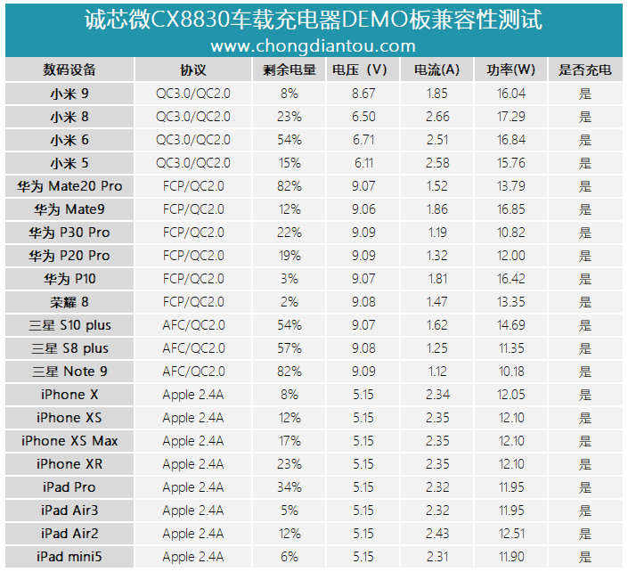 為了能夠更加精準地反映誠芯微CX8830的實際兼容性,也更貼近用戶的實際使用場景,充電頭網對誠芯微CX8830車充DEMO進行了真機實測,分別測試了華為、小米、三星、蘋果等主流品牌的手機、平板、移動電源等產品。下面我們來看詳細的兼容性測試結果:
