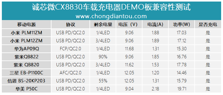 通過對多款移動電源的測試,我們也可以看到,誠芯微CX8830車充DEMO支持包括小米、華為、紫米、三星、倍思、華美等品牌在內的多款產品快充,兼容性表現很不錯。