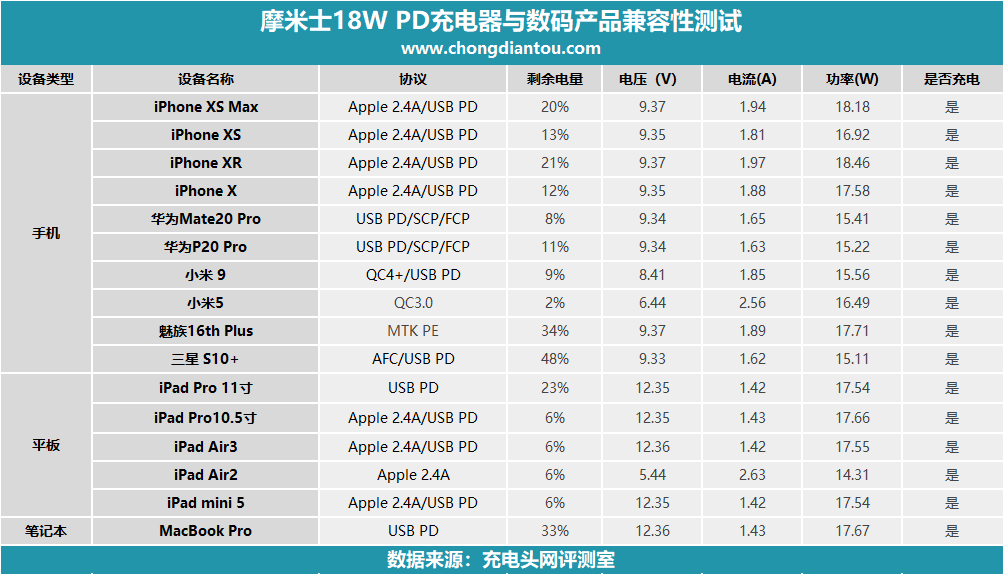小編把本次測試的兼容性數據做成了表格,方便大家觀看。可以發現摩米士18W PD充電器兼容性很不錯,均能與測試設備握手相對應最佳協議充電。小編還把功率大小按從高到低進行了排列,大家可以作個參考。