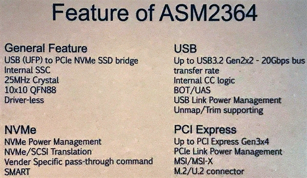 祥碩的新主控方案包含兩個部分,其一是xHCI主控制芯片“ASM3242”,其二是PCIe NVMe SSD橋接芯片“ASM2364”,利用了PCIe 3.0 x4接口,理論帶寬4GB/s,可以完全滿足USB 3.2 20Gbps(2.5GB/s)的帶寬需求,并支持NVMe。