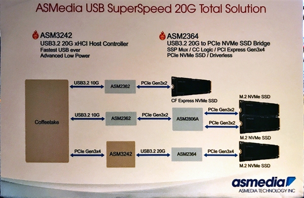 臺北電腦展上,祥碩(ASMedia)宣布已經率先完成USB 3.2 2x2主控制器,并進行了公開演示。