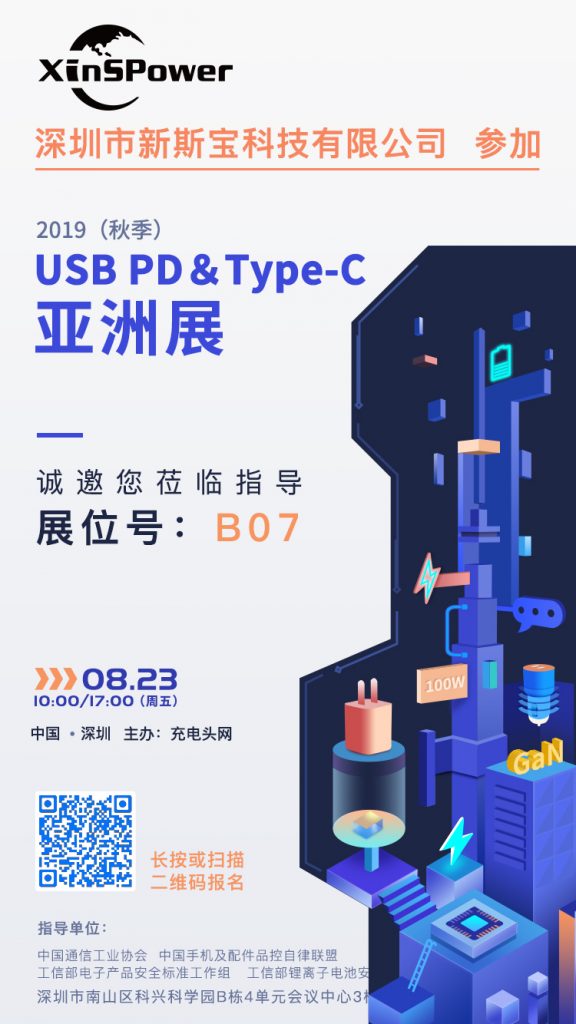 新斯寶將在8月23日參加2019(秋季) USB PD&Type-C亞洲展,展位設在B07,需要了解USB PD快充充電器成品的觀眾可在展會當天移步B07的展位進一步交流。 XinSPower將已以最好的質量、服務、價格協助品牌商打造爆款。