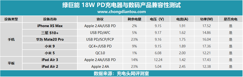 最后將綠巨能 18W PD充電器的數碼產品兼容性數據做一個統計,這款充電器支持PD、QC充電協議,相應的設備都能準確握手PD快充,像iPad Air 2這種不支持PD的設備也能開啟Apple 2.4A充電模式。