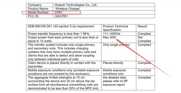值得注意的是,華為CP61無線充電器在FCC顯示為“Not Complied”,所以不排除實(shí)際輸出可能是25W的可能。