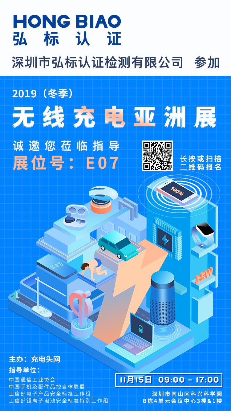 溫馨提示:弘標認證 將參加11月15日中國深圳召開的2019(冬季)無線充電亞洲展,展位設在E07,需要了解無線充Qi認證的觀眾,可在展會當天前往展位詳細交流。