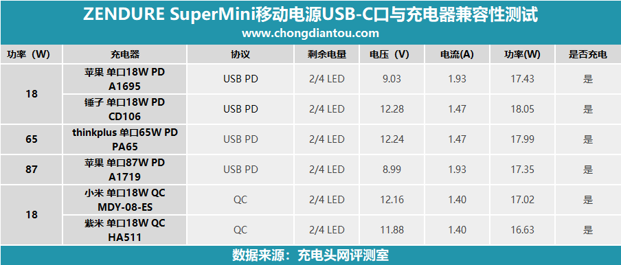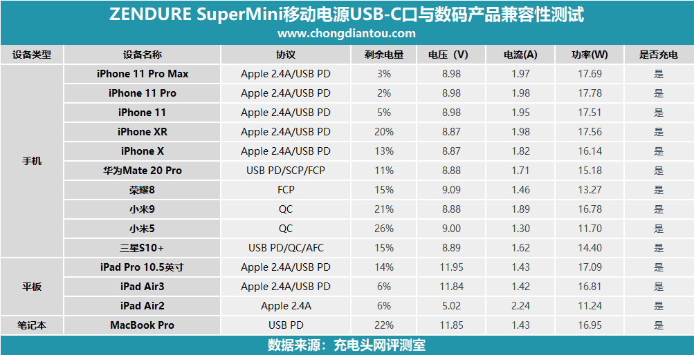 以上是ZENDURE SuperMini移動電源USB-C口輸出實測的數據結果,該接口支持USB PD、QC、FCP快充和Apple 2.4A充電協議,兼容性不錯,均能與相關設備準確握手,沒有PD快充的蘋果設備也能順利握手Apple 2.4A模式進行充電,獲得不錯的充電速度。得益于支持PD快充,它還能為兼容性較好的筆記本電腦充電,可以用來應急使用。