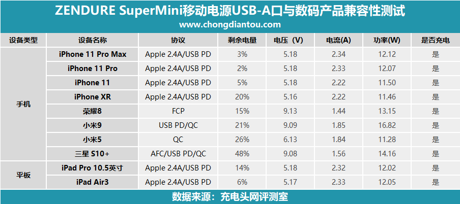 ZENDURE SuperMini移動電源USB-A輸出口兼容性十分不錯,均能與相關設備準確握手對應協議、快充。