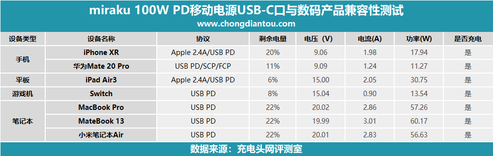 Miraku 100W PD移動(dòng)電源USB-C口輸出兼容性表現(xiàn)十分不錯(cuò),均能與測(cè)試設(shè)備握手相對(duì)應(yīng)快充。測(cè)試中多款PD筆記本電腦都能正常握手充電,功率也能達(dá)到較高的水平。