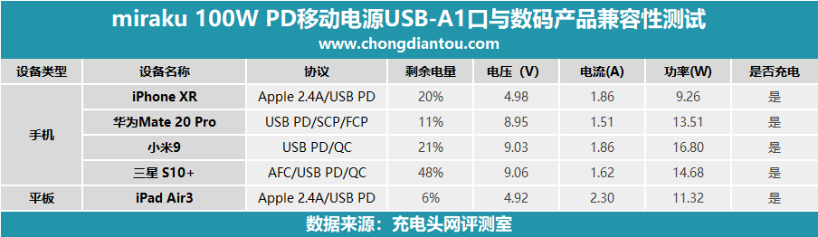 Miraku 100W PD移動(dòng)電源USB-A1口,支持Apple 2.4A、QC 2.0、QC 3.0、AFC、FCP協(xié)議,測(cè)試中各設(shè)備均能握手對(duì)應(yīng)快充。
