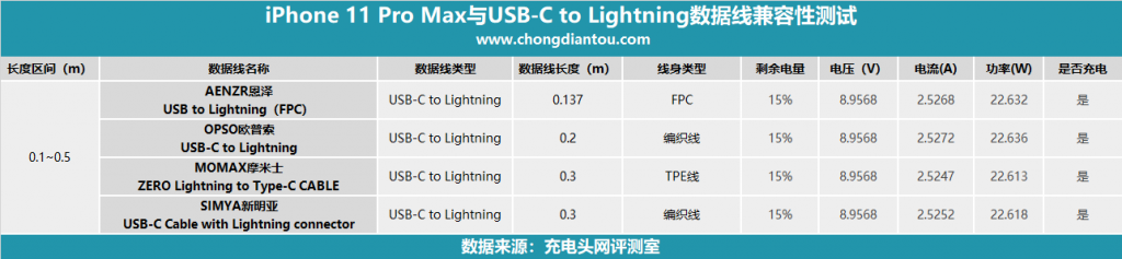 iPhone 11 Pro Max與長度為0.1~0.5m的USB-C to Lightning數據線兼容性測試完畢,全都兼容可正常開啟PD快充,與蘋果原裝USB-C to Lightning數據線充電效果相比,基本一致。