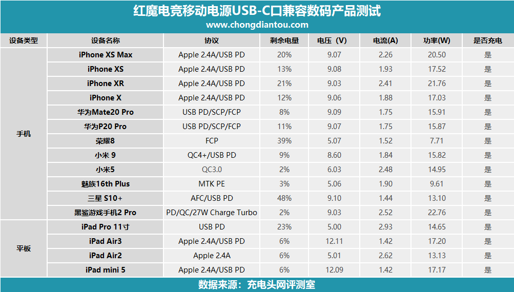 兼容性測試環節對比,主要說說兩款移動電源的USB-C輸出接口,小編分別為兩款移動電源進行了16款產品兼容性測試,數據制成表格如下。
