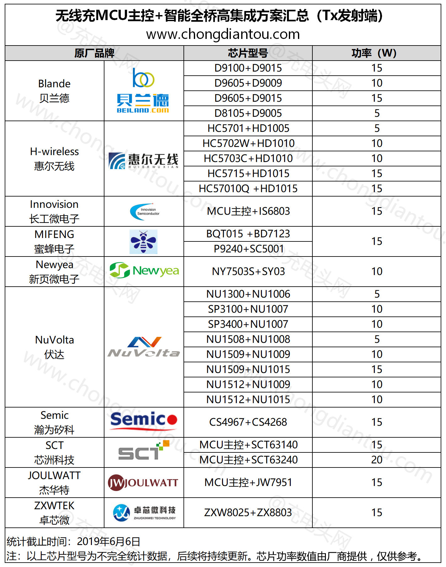 為了方便下游企業選型對比,充電頭網將無線充SoC芯片方案,以及MCU主控+PowerStage智能功率全橋方案進行了整理匯總(按首字母先后排序)。