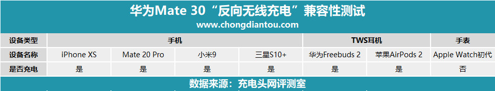 以上是測試數據,制成表格方便大家觀看。華為Mate 30對支持“Qi”協議無線充的手機、耳機都能有很好的支持,而對于像Apple Watch初代這類的私有協議產品將無法給其充電。