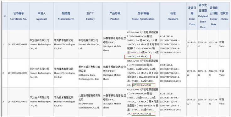另外,華為有3款充電器近日也通過了3C認證,從型號規格欄目里可以看到,充電器擁有10V4A輸出檔,這正是符合華為40W SCP快充協議的性能規格。由此可以推斷,榮耀Vera30應該搭載了華為40W SCP快充。