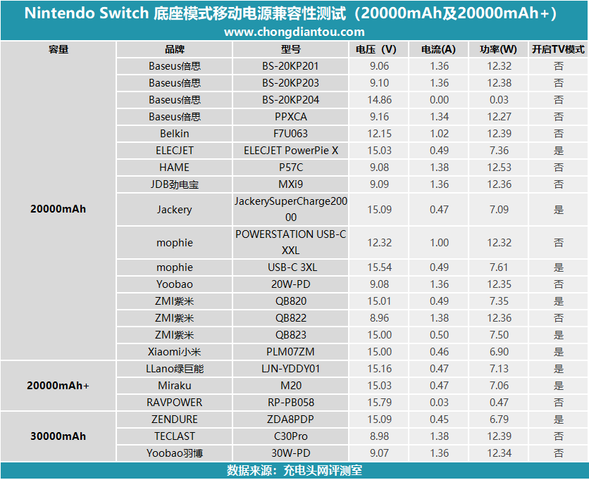 在經(jīng)歷了二十余款20000mAh、20000mAh+,甚至30000mAh的移動電源對Nintendo Switch直充模式和底座模式的充電測試后,相信大家已經(jīng)對不同容量不同品牌的移動電源對Nintendo Switch直充模式以及底座模式的充電以及有所了解了。由最后整理出的表格得知,在移動電源對Nintendo Switch直充模式下,大多數(shù)都可以正常握手9V、12V甚至15V電壓檔位,都可以順利的開啟PD快充模式;在這些移動電源輸出Nintendo Switch底座TV模式下,大多數(shù)具備15V3A輸出檔的移動電源都可以成功開啟底座TV模式,但還是有少數(shù)對Switch底座存在兼容性問題,想要通過移動電源獲得TV模式功能的可以按照上面測試結果去購買對應的產(chǎn)品。