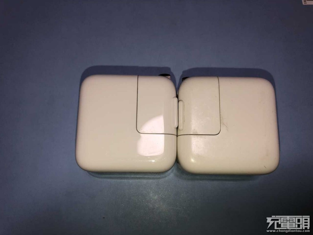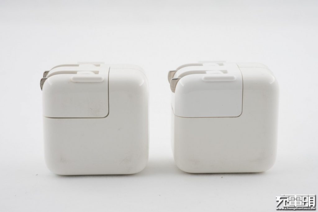 對比一下蘋果10W充電器和12W充電器的體積,幾乎是一樣大小。