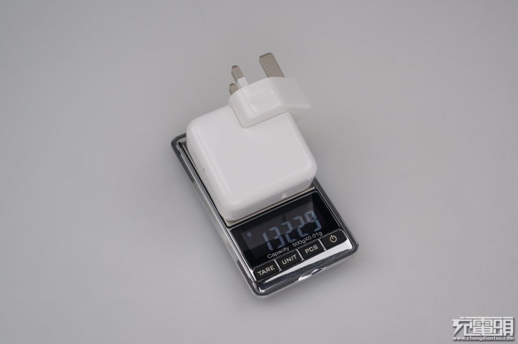 港版電源適配器+插頭一共重132g。產品外表與以前蘋果電源適配器產品類似,都是使用圓弧邊四方設計,寬度*長度為56mm*56mm。厚度28mm。
