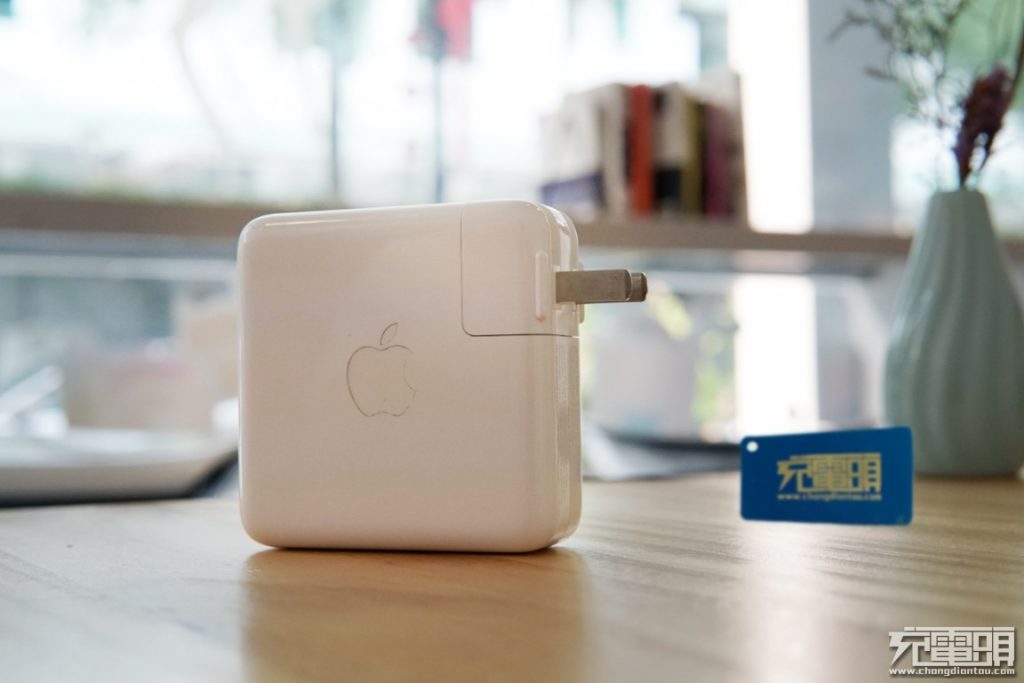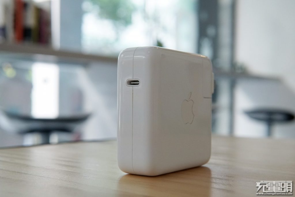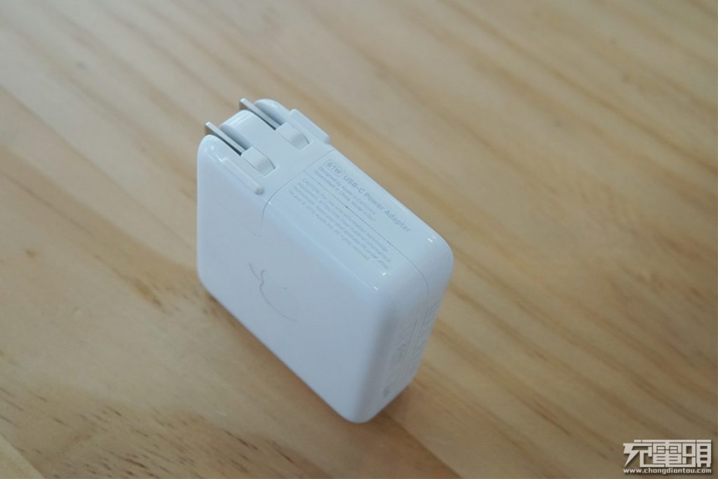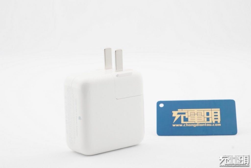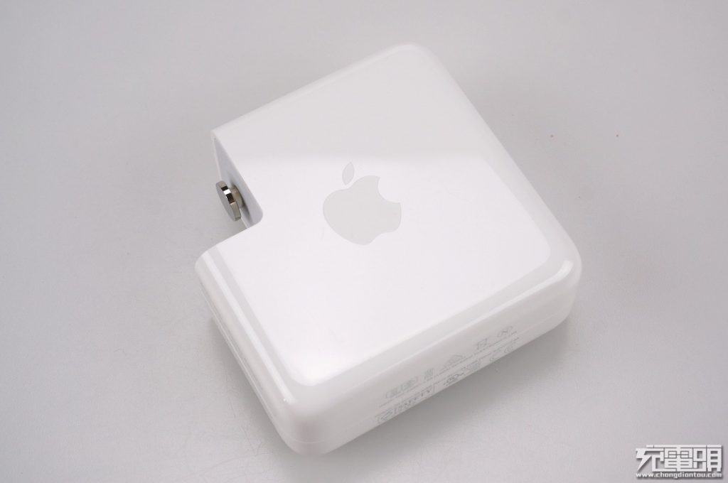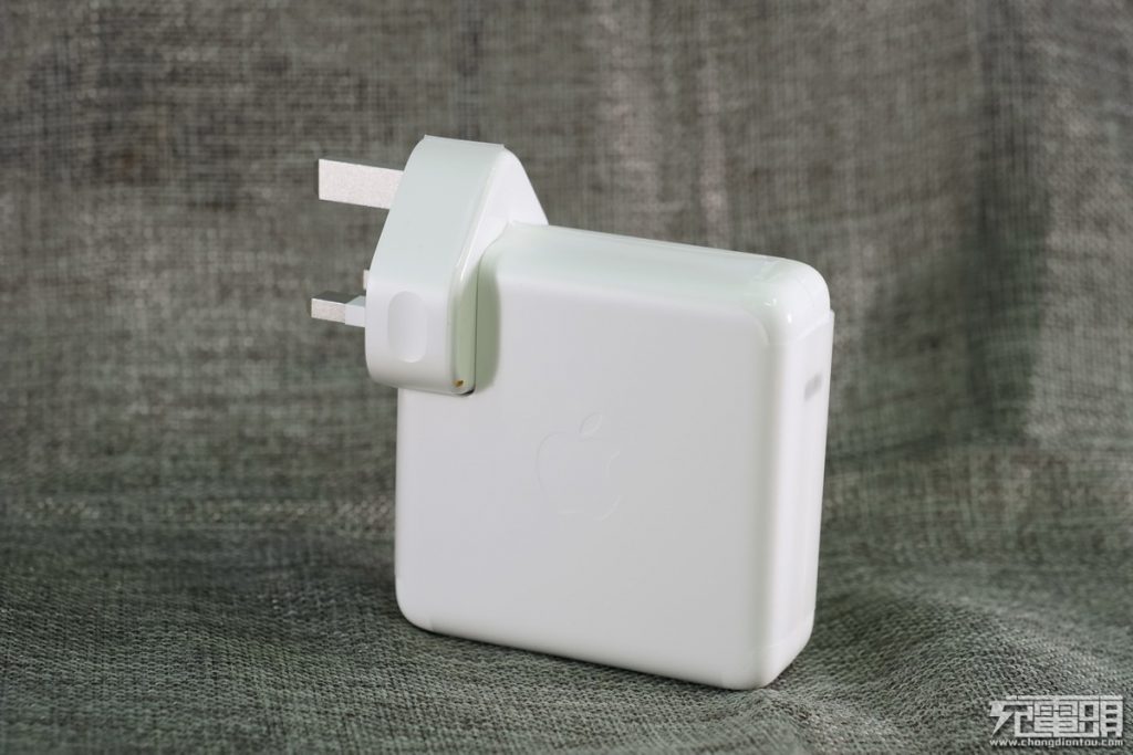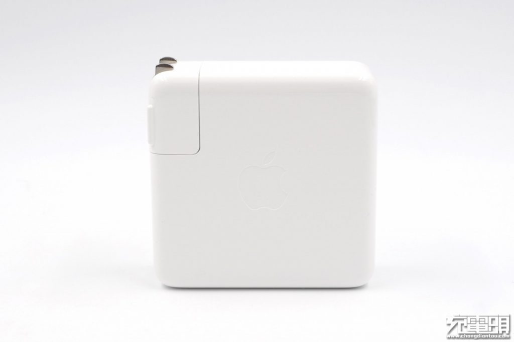 蘋果61W充電器整體表面光滑中間使用磨砂凹陷做出apple LOGO。USB-C插孔金屬包邊,耐用度更高。產品帶上插頭重量218g。正方形尺寸長寬均為74mm,29W、61W、87W三款產品厚度都是相同的28mm。