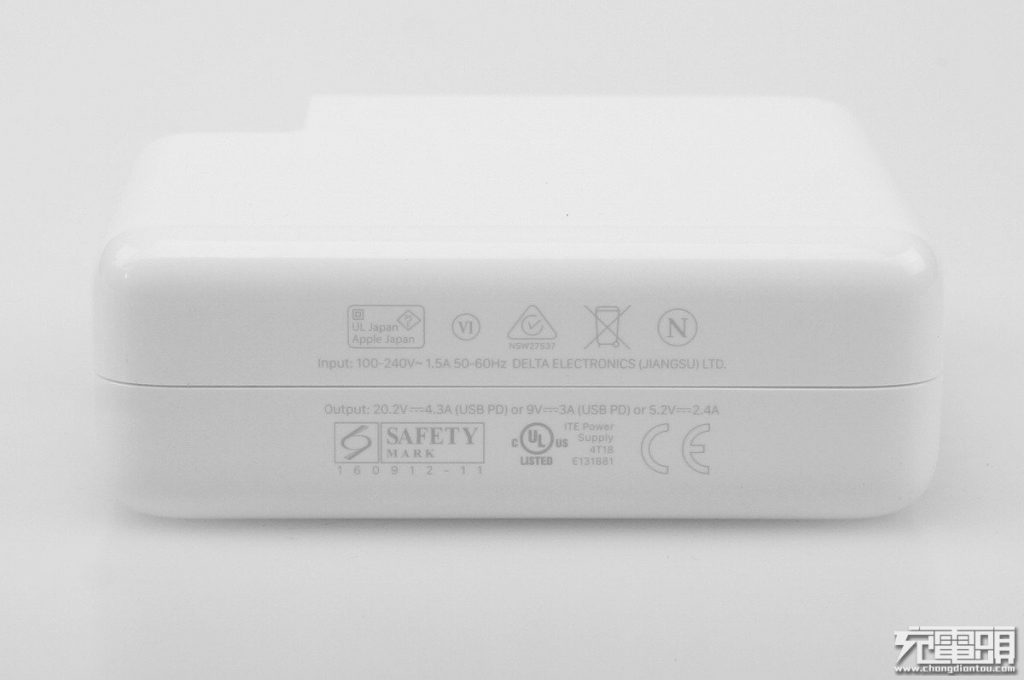蘋果87W充電器一側是參數鐳雕,100-240V全球電壓,輸出是20.2V4.3A,9V3A 5.2V2.4A,另一側鐳雕型號A1719。