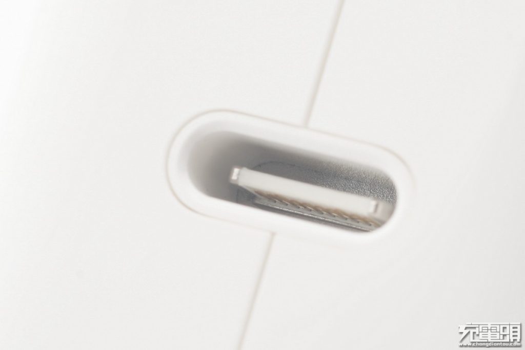 需要強調的是從這款起,后面所有充電器都是USB-C接口,支持PD快充。蘋果29W PD 充電器一如既往可拆卸設計、可折疊插腳,但殼身少見的采用一體式機身。插頭拆卸后,可以替換成其他不同插腳的插頭,也方便旅行收納。去掉插頭后可以看到里面是我們常見的單邊齒兩腳8字線插座,外面是充當地線的T型固定座,用8字線插入也可以使用,但沒接地功能不建議這樣使用。