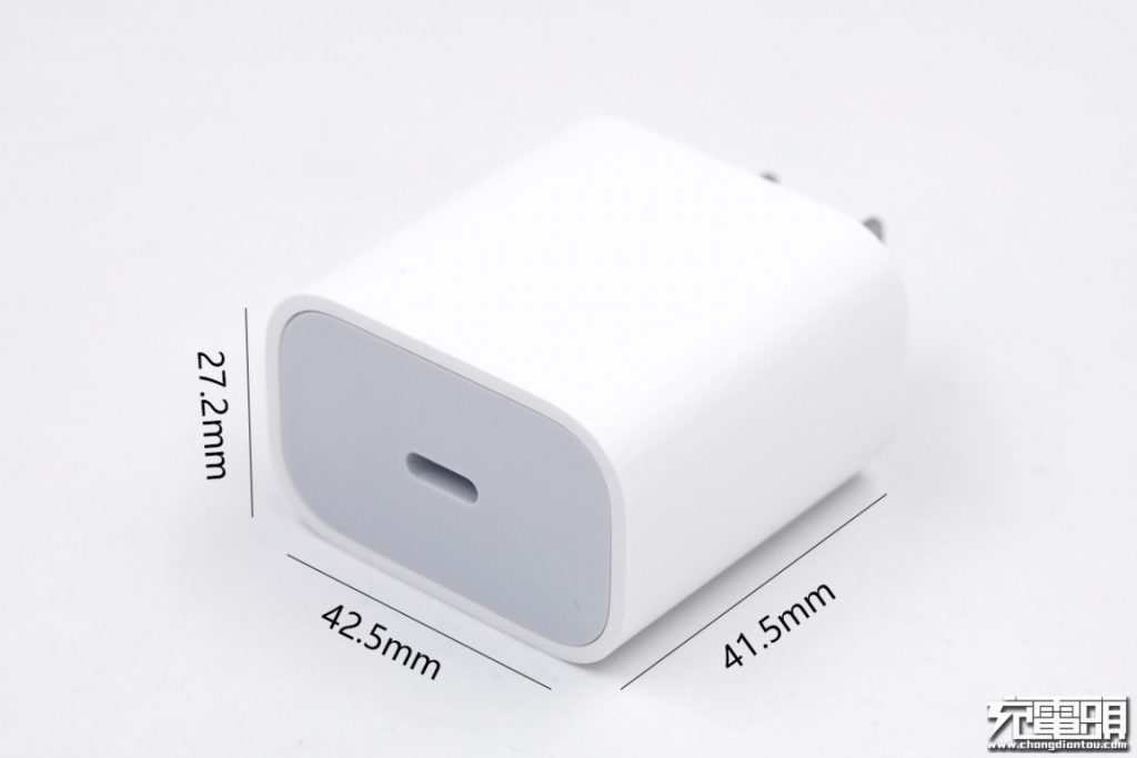 充電器外殼采用了白色PC材質,高光處理,插腳不可折疊。大小尺寸為42.5mm*41.5mm*27.2mm。