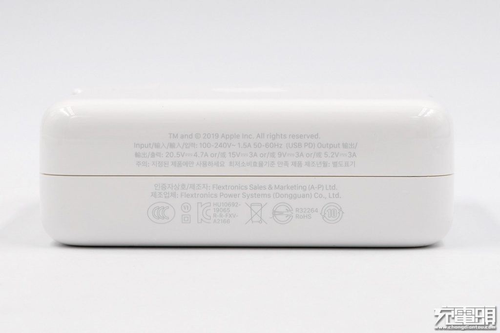 這款充電器接口為USB-C,使用ChargerLab POWER-Z FL001S檢測到支持的電壓檔位,5V3A、9V3A、15V2A、20V1.5A四檔電壓。當時蘋果官網建議與以下設備搭配:12 英寸 MacBook。同時,還兼容自家所有支持USB PD快充的iPhone和iPad設備,其中iPhone機型包括iPhone X、iPhone 8、iPhone 8 Plus,iPad機型包括iPad Pro 12.9 英寸 (第二代)、iPad Pro 12.9 英寸 (第一代)、iPad Pro 10.5 英寸。