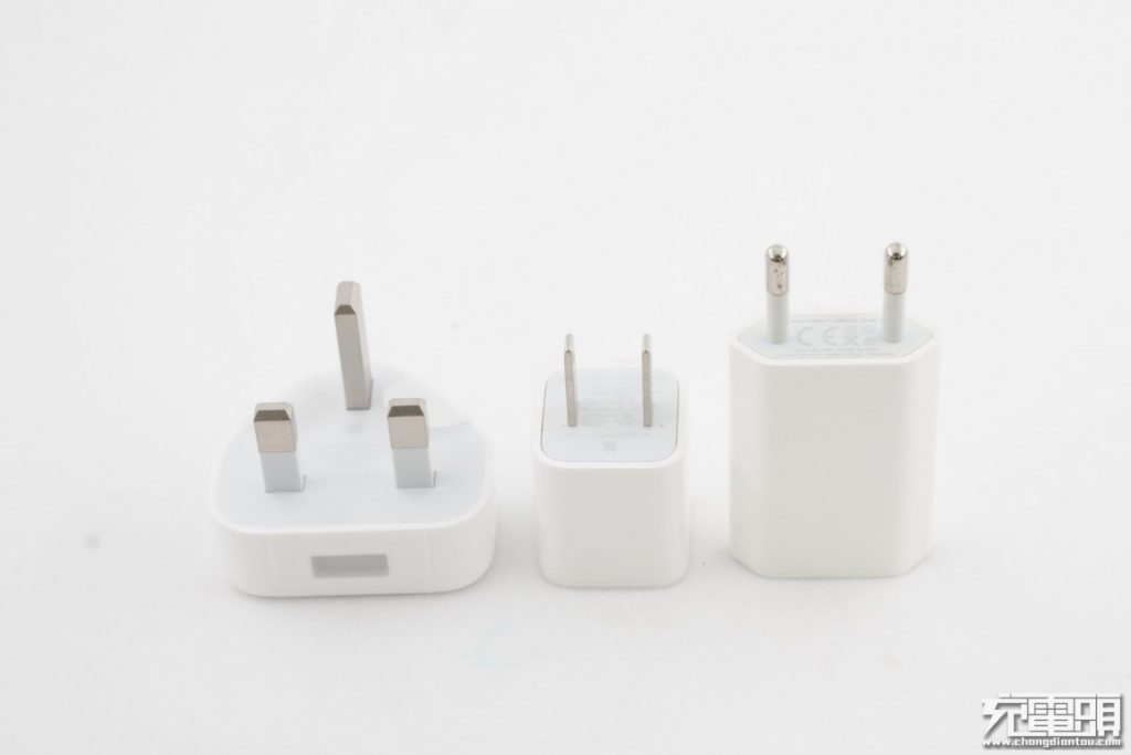 上圖分別是港行、國行、歐規三種規格的充電器,都是5V/1A,其中港行的最大;國行與美規充電器基本一致;歐規大家可能很少見到,再圓潤一些的話就比較接近蘋果18W充電器,看來蘋果的設計延續性還是很強的。