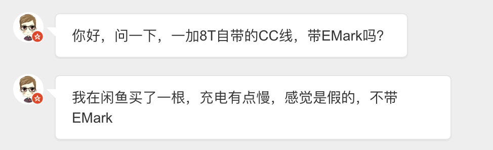 8、一加8T自帶的CC線帶EMark嗎?在閑魚買了一根,充電有點慢,感覺是假的。
