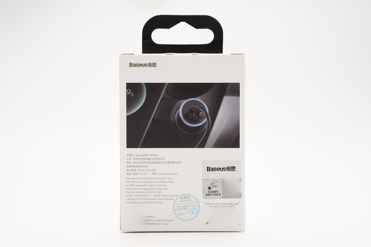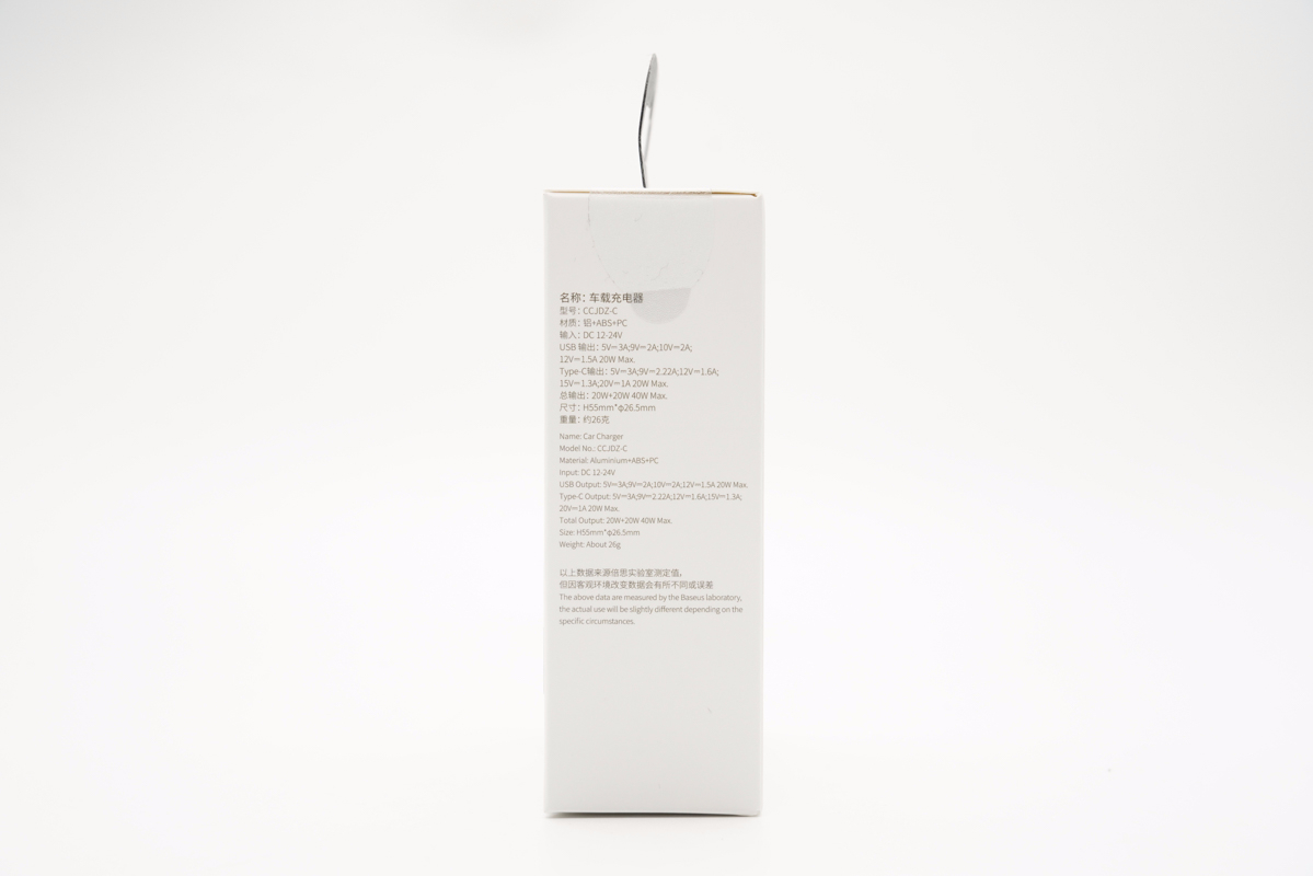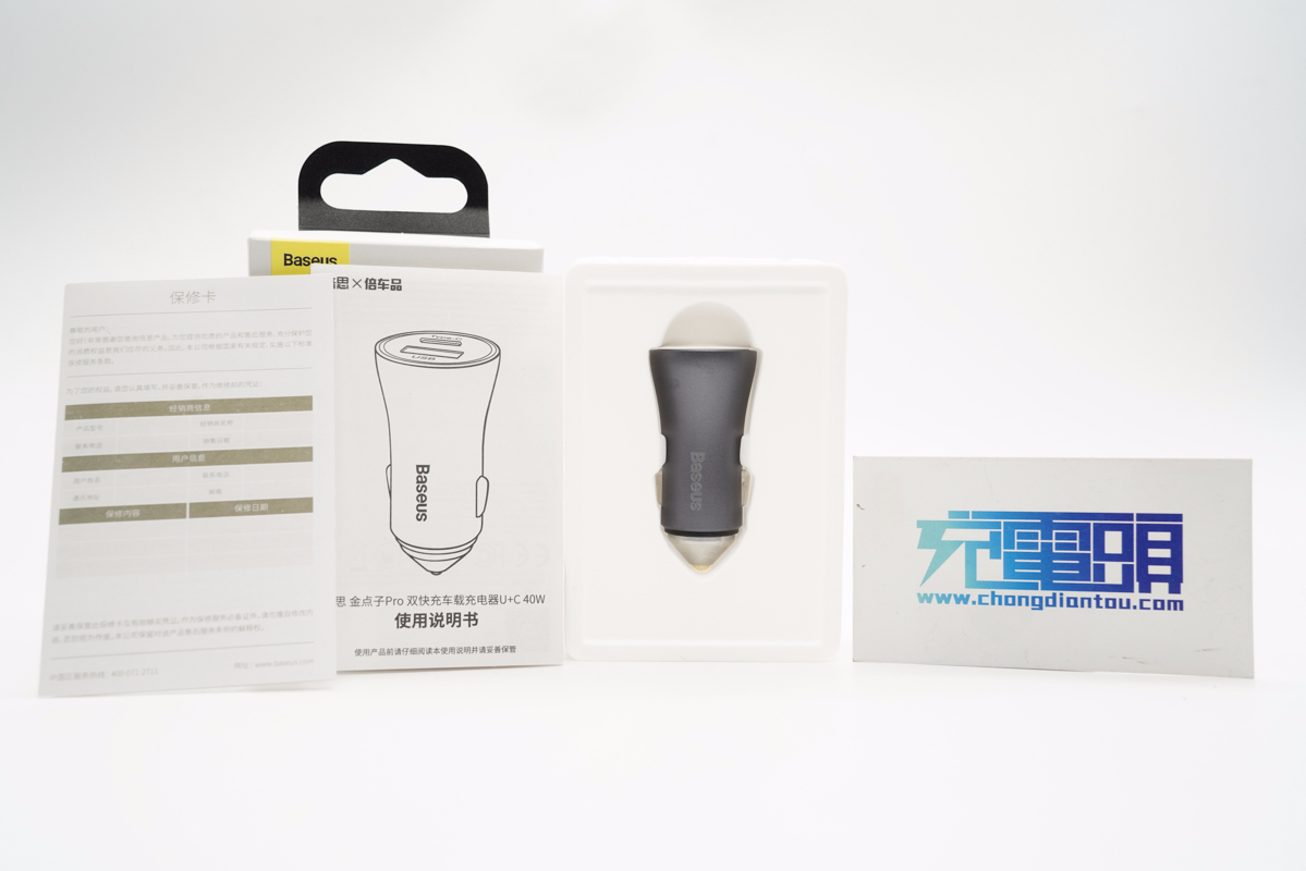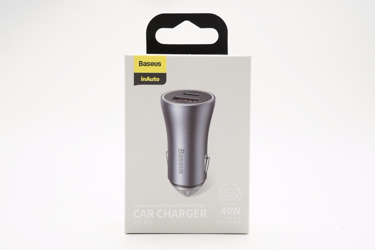 包裝盒正面印有Baseus品牌、車充外觀圖、名稱以及40W標識。