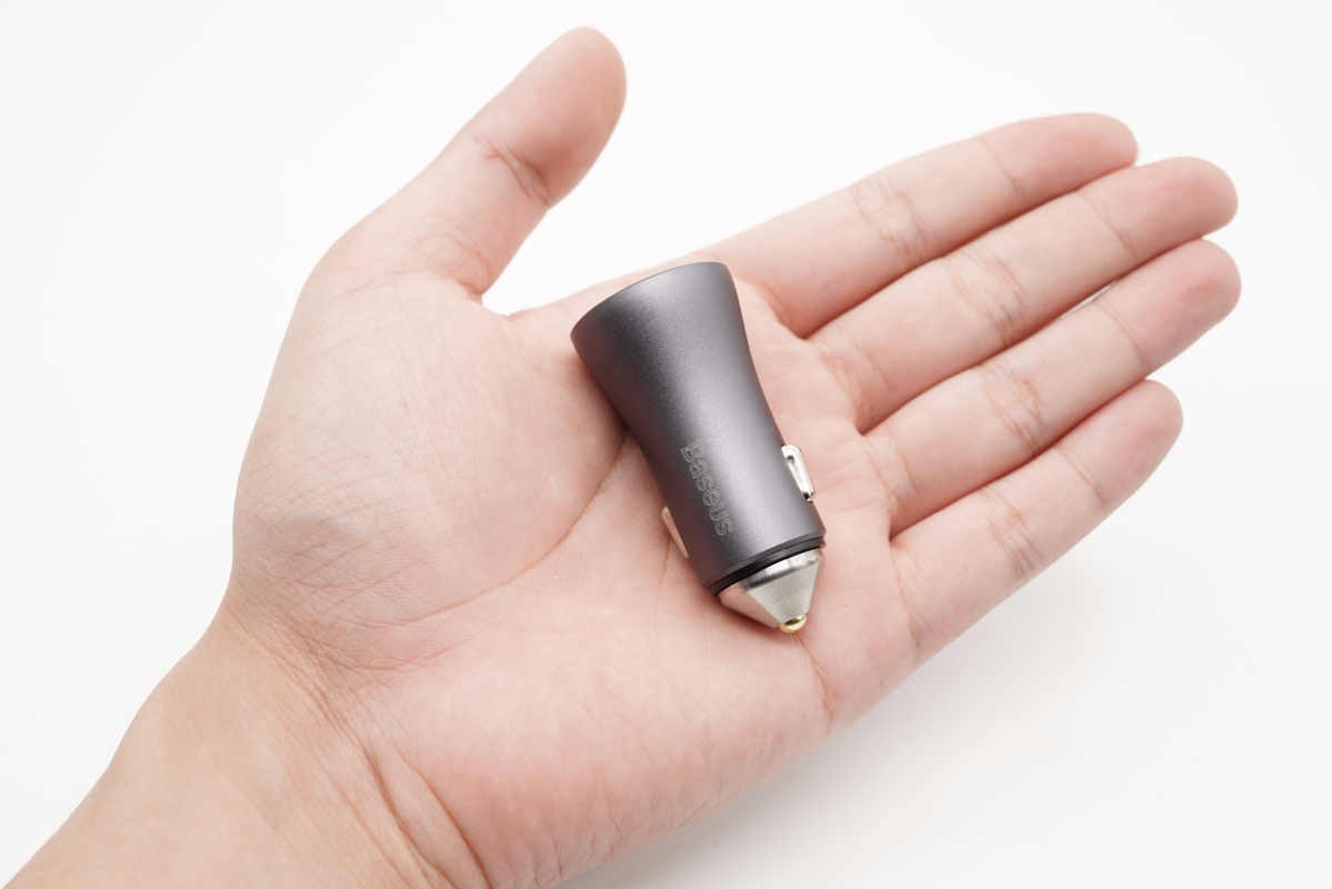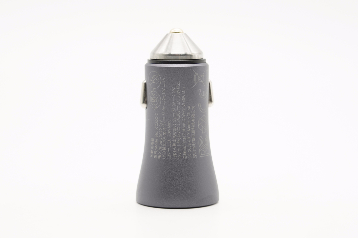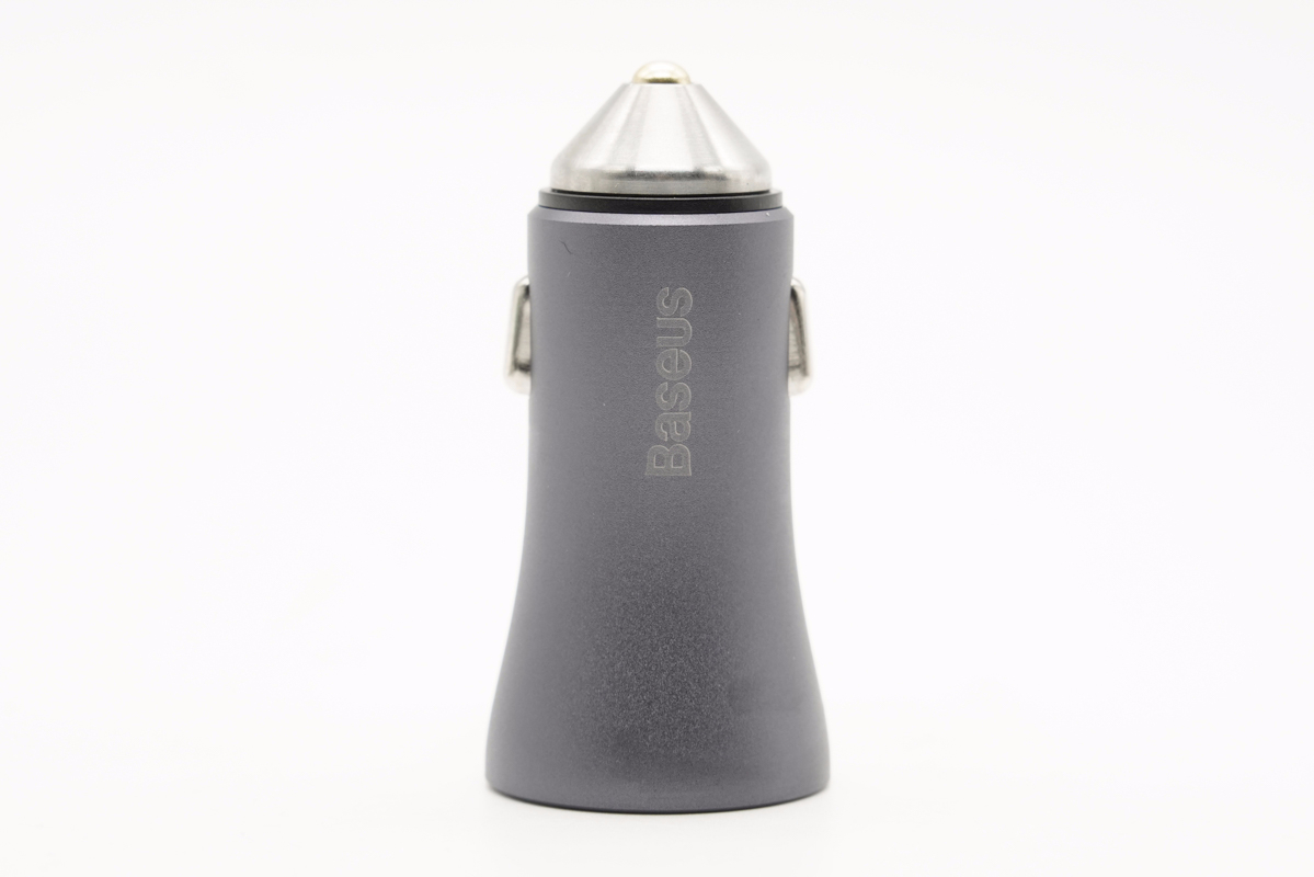 倍思這款車充采用“導彈”造型設計,主體外殼采用鋁合金材質,正負極之間設有塑料隔離。灰色機身殼表面噴砂處理,正面印有Baseus。