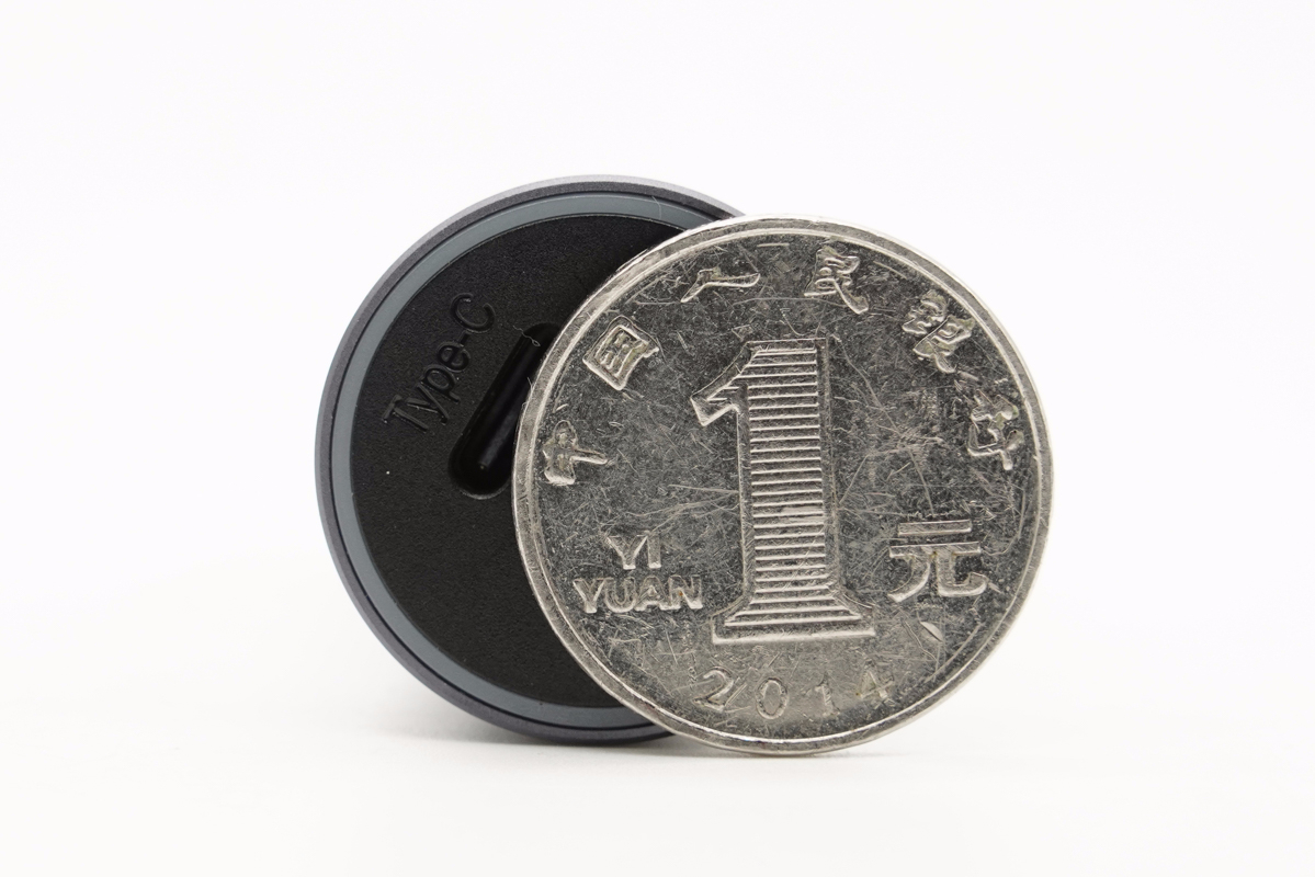 輸出頂面和一元硬幣直觀對比,兩者大小相當。