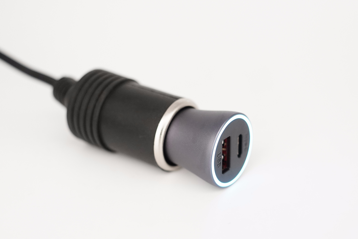 接通電源,車充頂面導光圈亮白光。