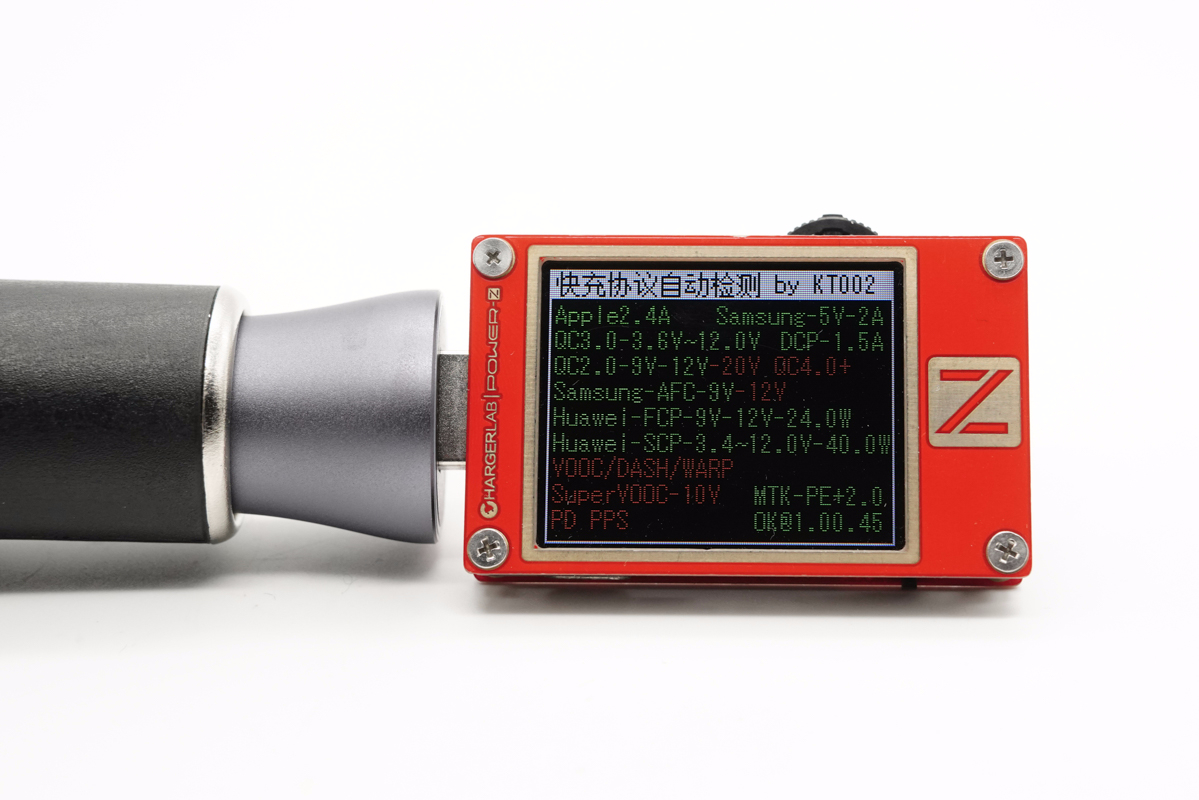 另外使用KT002檢測USB-C口輸出協議,顯示支持Apple 2.4A、Samsung 5V2A、DCP協議,以及QC2.0/3.0、AFC、FCP、PD3.0和PPS快充協議。