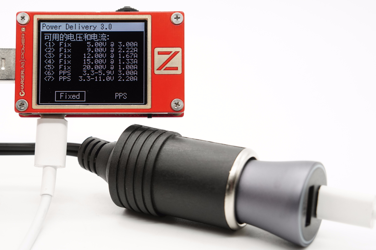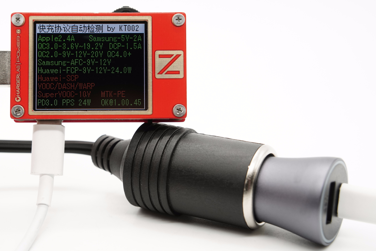外接電源為車充輸入24V,模擬真實車載環境,使用ChargerLAB POWER-Z KT002檢測USB-A口輸出協議,顯示支持Apple 2.4A、Samsung 5V2A、DCP協議,以及QC2.0/3.0、AFC、FCP、SCP和PE2.0快充協議。