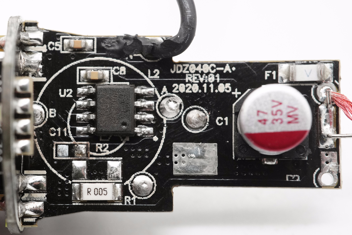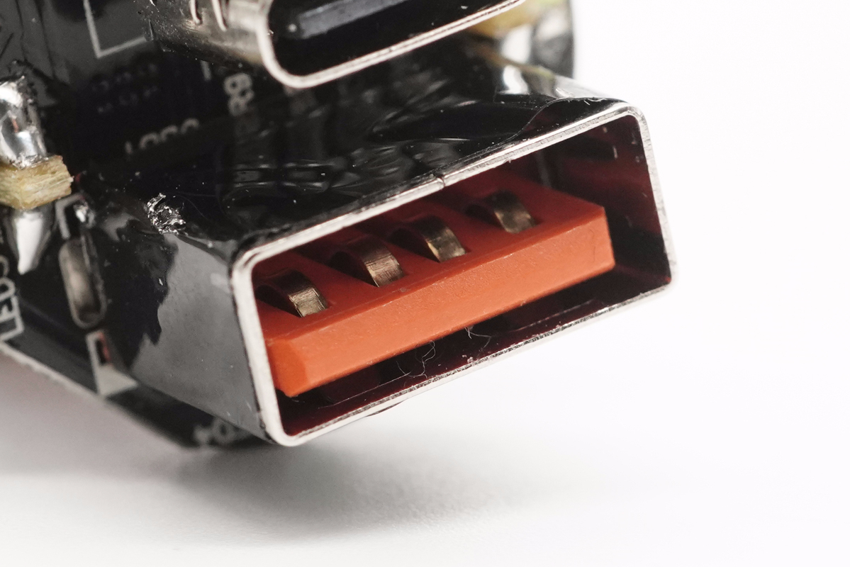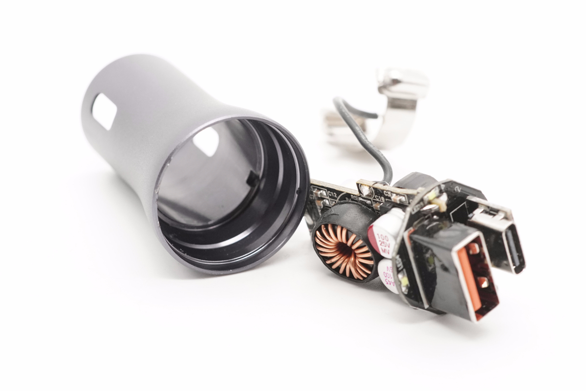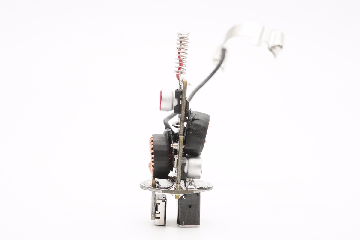 從側面看去,車充由兩塊小板組成,輸入端小板兩面均設有電感與濾波電容,輸出端小板上焊接USB母座。