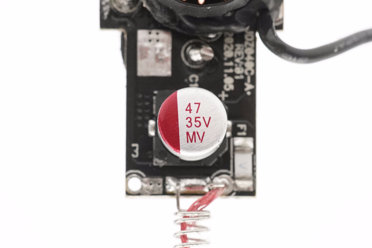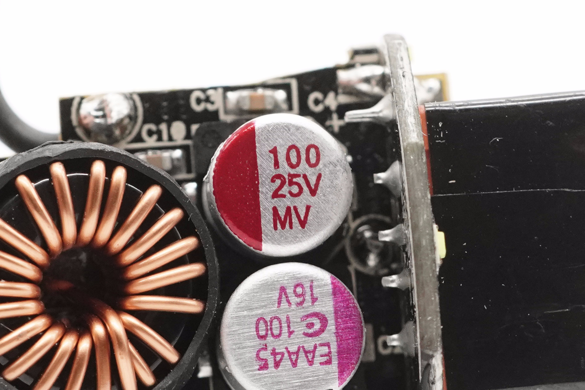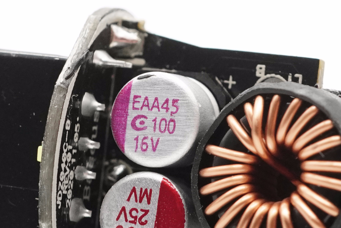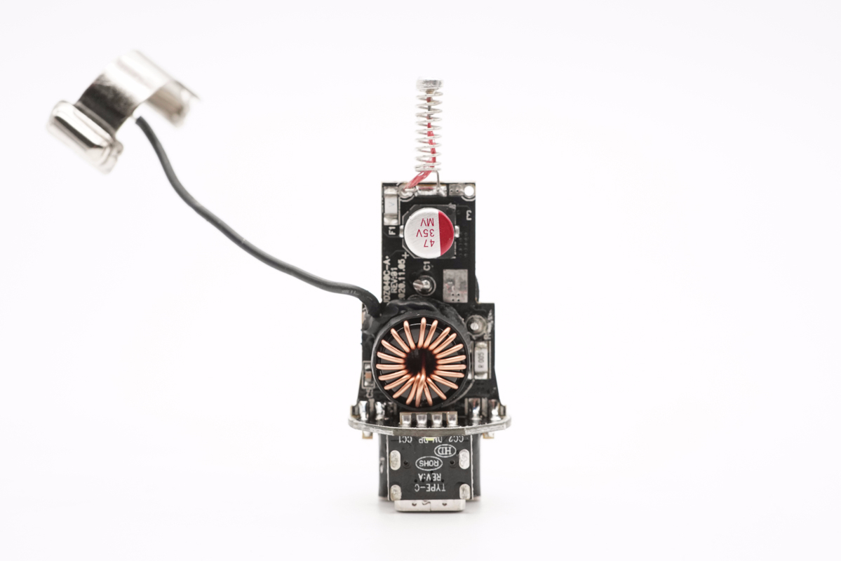 PCB板正面一覽,設有輸入濾波固態電容以及USB-C電路降壓電感,負極彈片使用導線和PCB板連接。