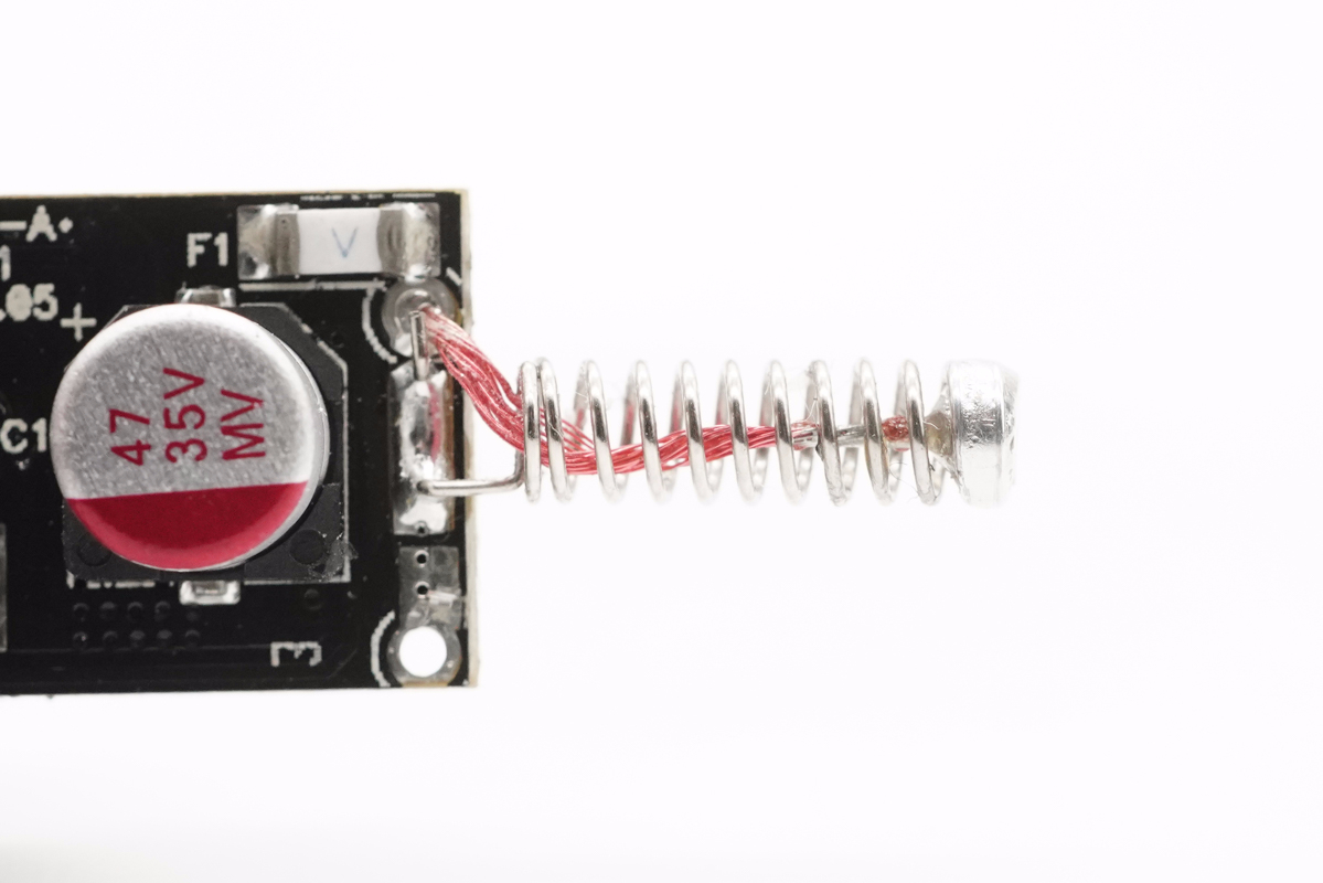 正極彈簧內焊接一根紅色導線降低電阻,輸入端有一顆白色貼片保險絲。