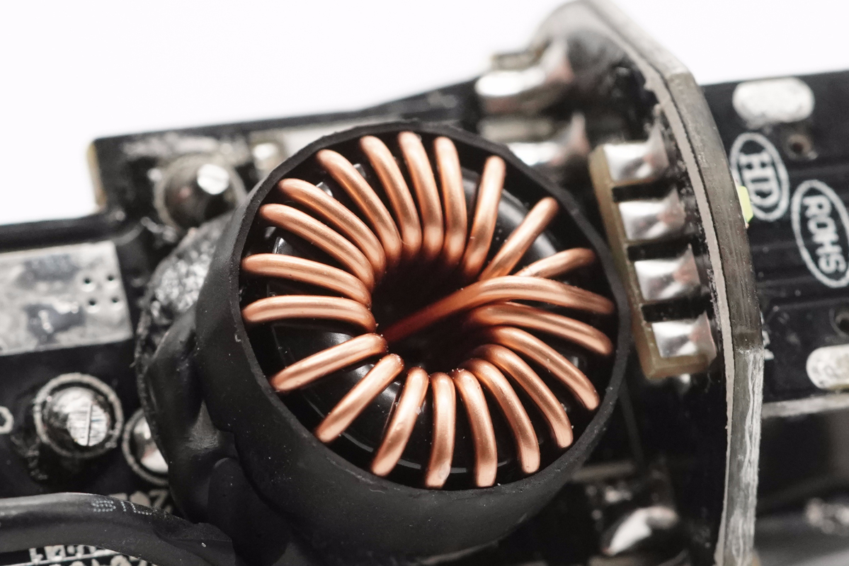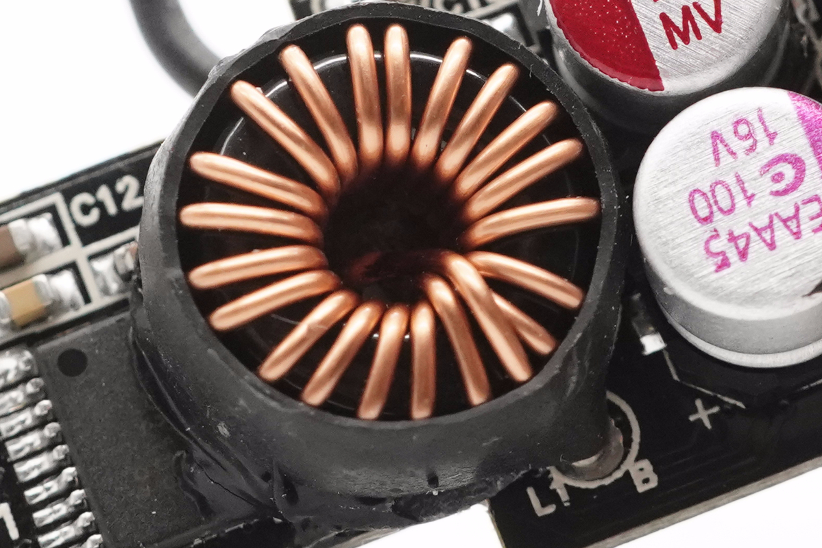 降壓電感特寫,外套熱縮管,底部有青稞紙用來絕緣。