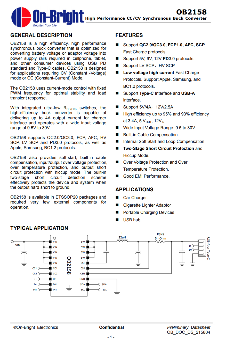 USB-A口降壓協議IC采用昂寶OB2158。這是一顆內置協議的高性能恒壓恒流同步降壓轉換器,支持多種快充協議和PD3.0快充協議,支持5/9/12V輸出,支持華為SCP協議,內置線損補償,工作電壓9.5到30V,內置開關管,支持完善的保護功能。
