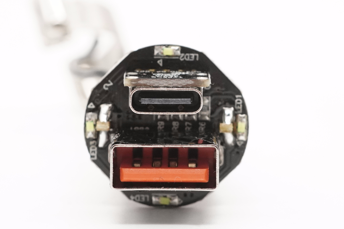 輸出頂面設有1A1C接口,橘紅色和黑色膠芯,邊緣是一圈LED導光圈。