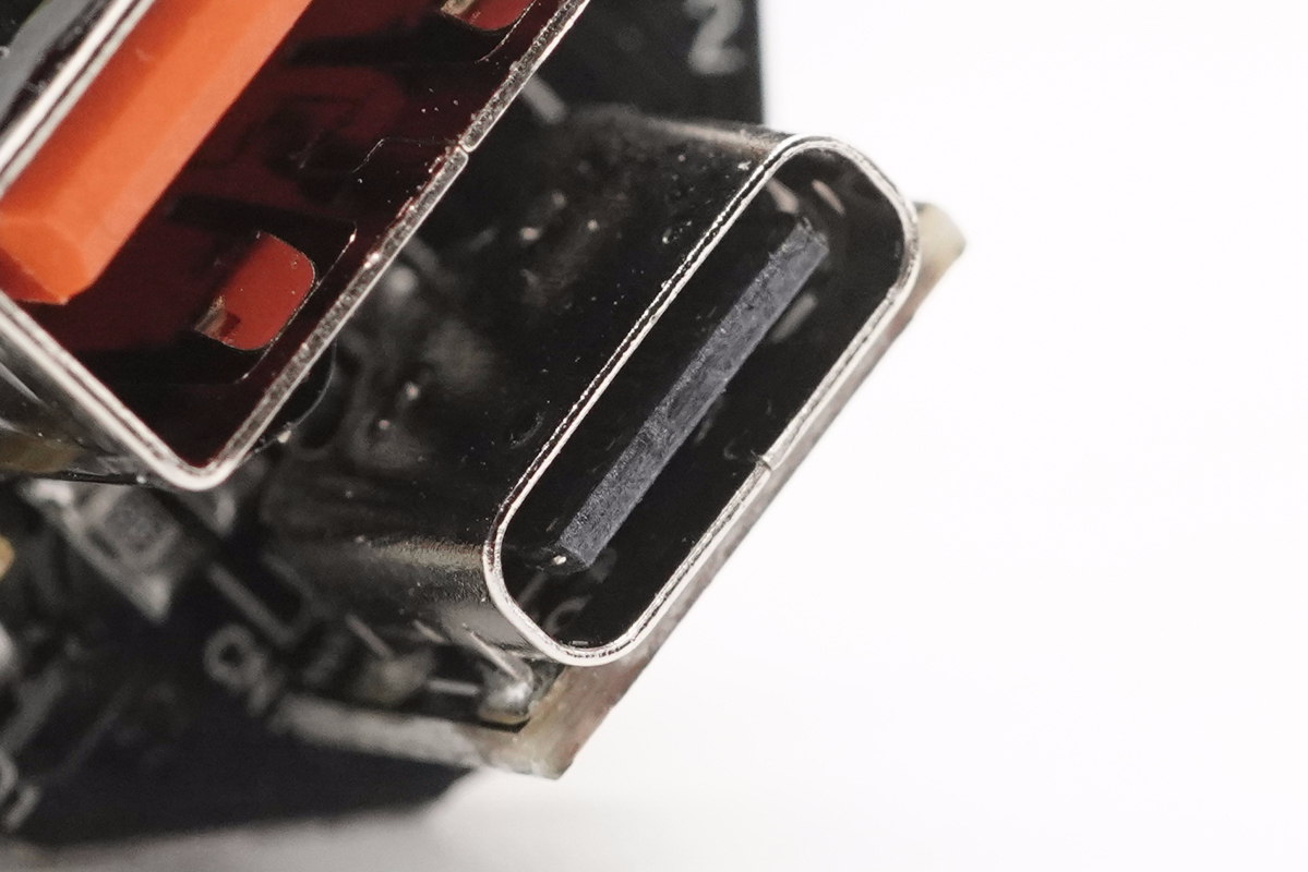 USB-C母座特寫,黑色膠芯不露銅,內部夾鋼片加固。
