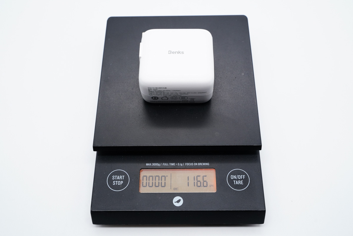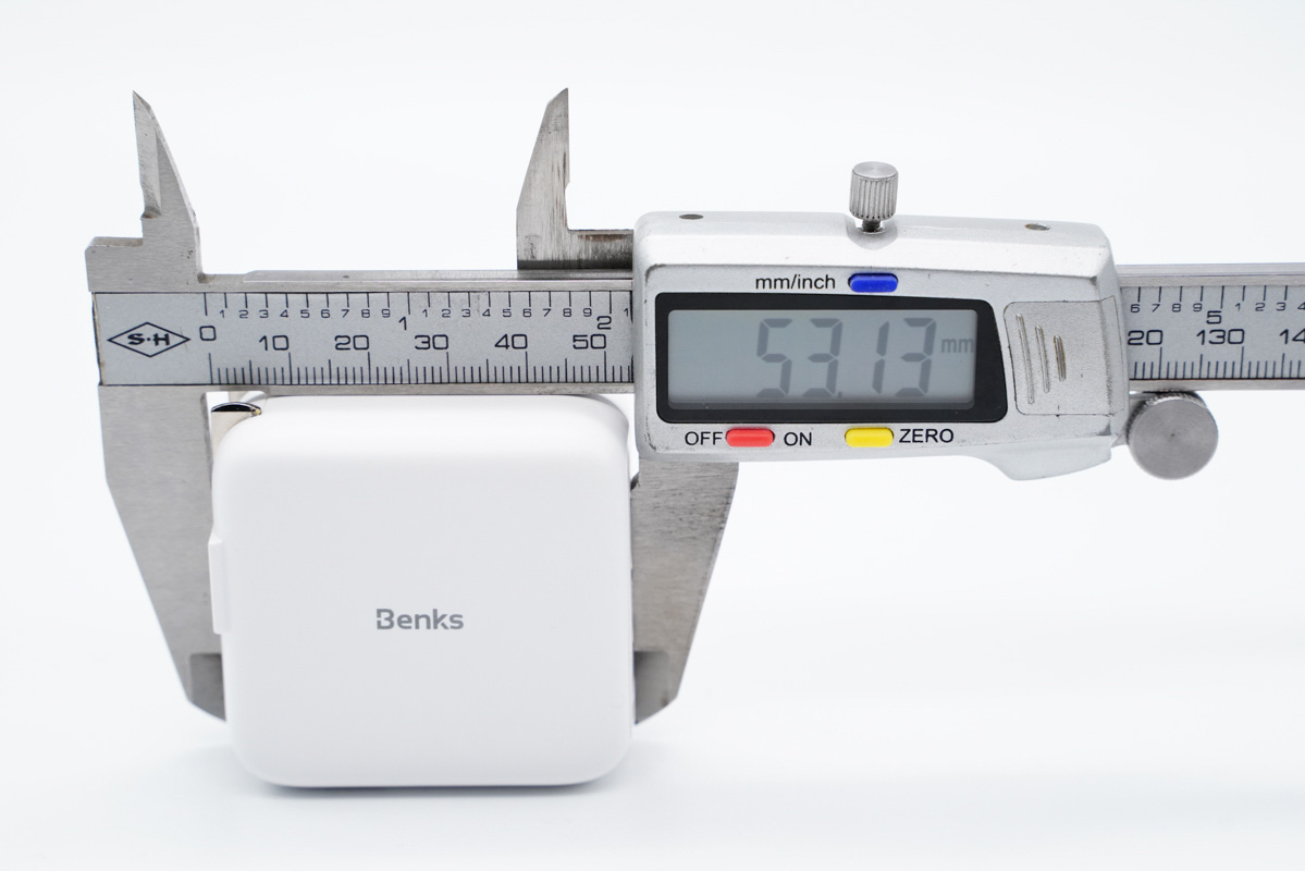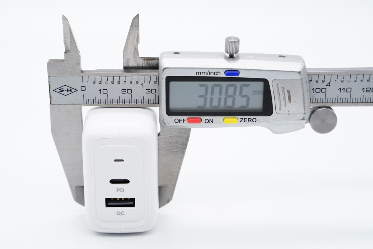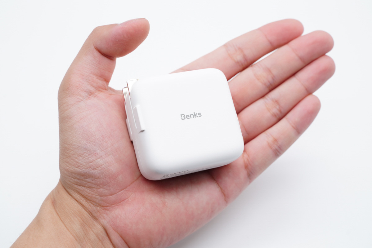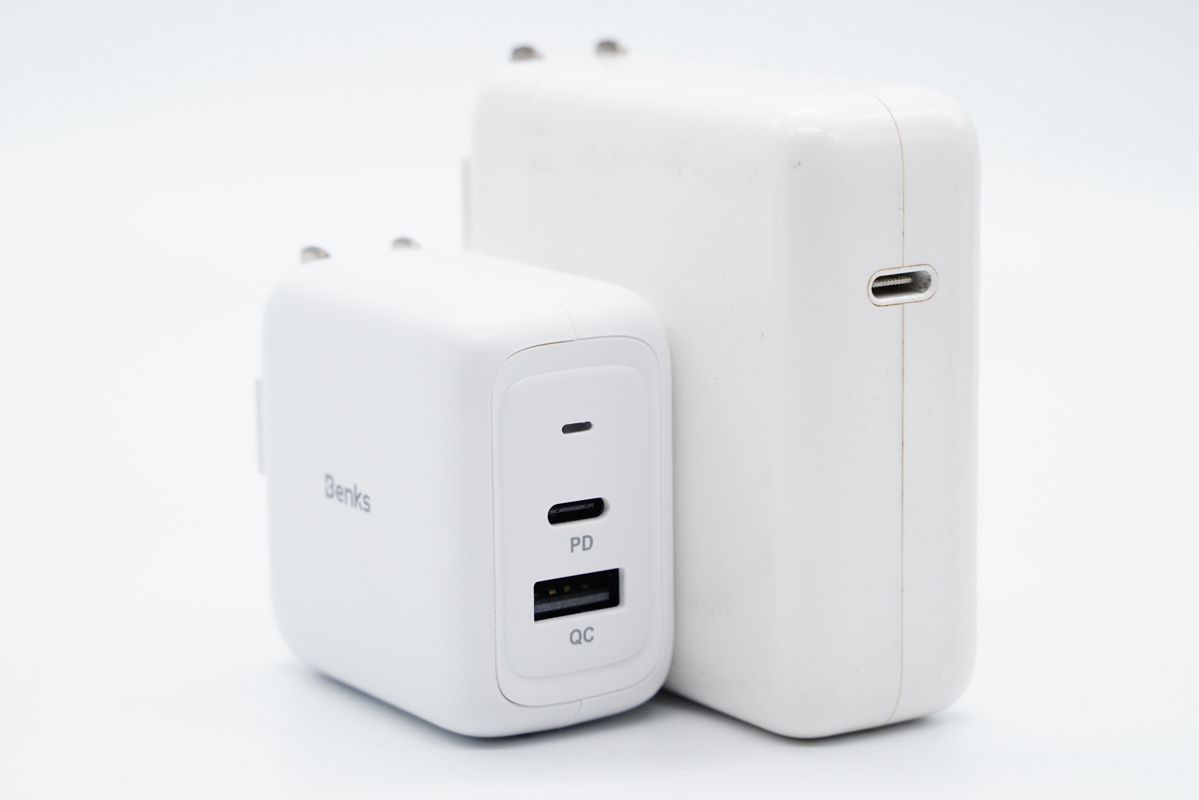 和蘋果61W充電器直觀對(duì)比,體積優(yōu)勢(shì)非常明顯。