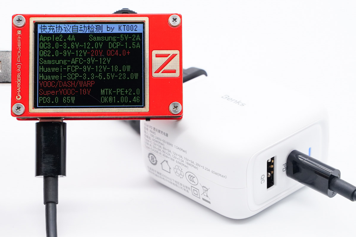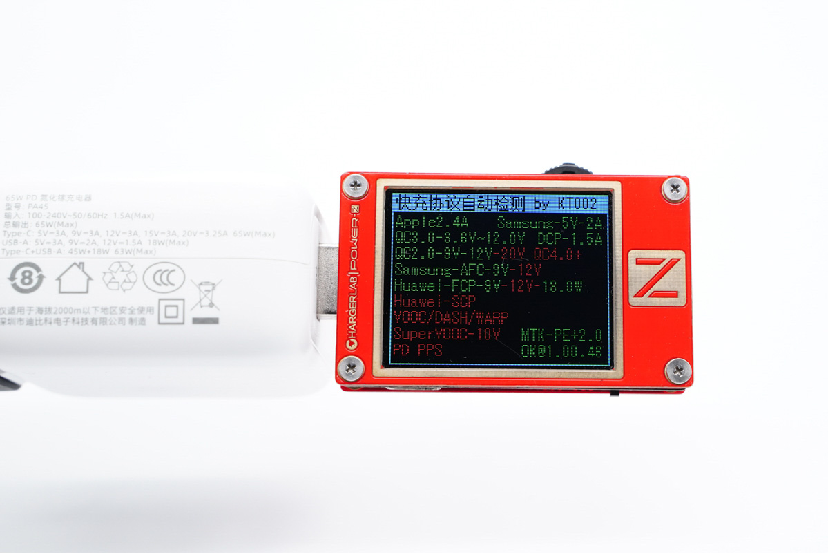 使用ChargerLAB POWER-Z KT002檢測(cè)USB-A口輸出協(xié)議,顯示支持Apple 2.4A、Samsung 5V2A、DCP協(xié)議,以及QC2.0/3.0、AFC、FCP、PE2.0快充協(xié)議。