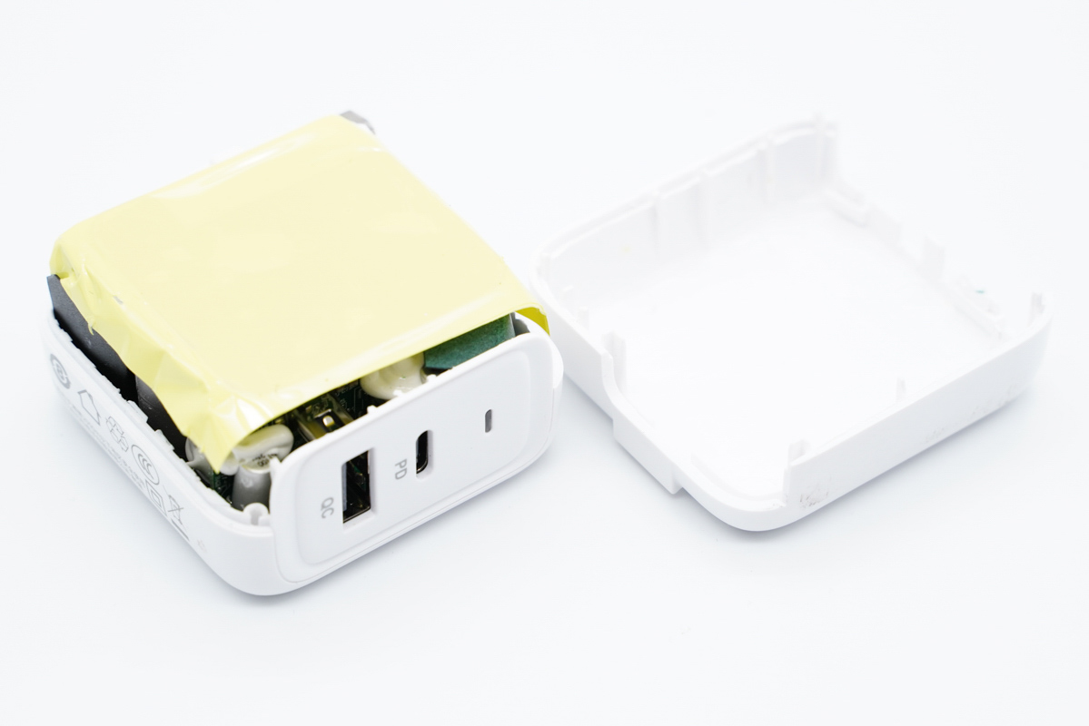 產(chǎn)品另一大特點(diǎn)便是體積非常小巧,作為一款65W級(jí)多口充電器,竟比蘋果30W充電器還要小,加上配備可折疊插腳,非常便攜。下面充電頭網(wǎng)就對(duì)其進(jìn)行詳細(xì)拆解,一起來(lái)看看充電器內(nèi)部是如何設(shè)計(jì)的。