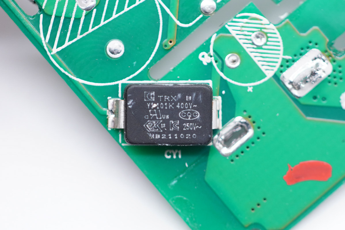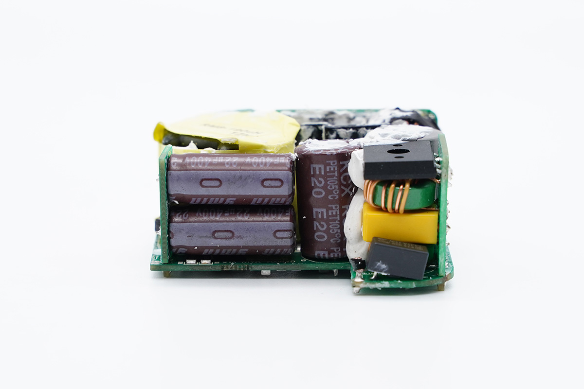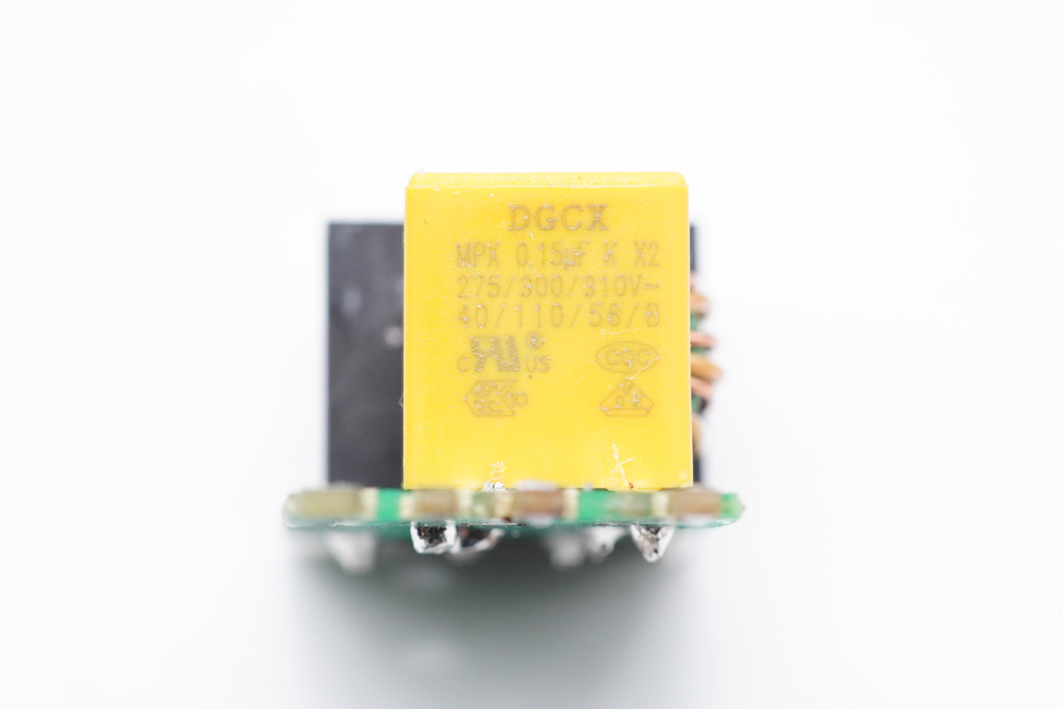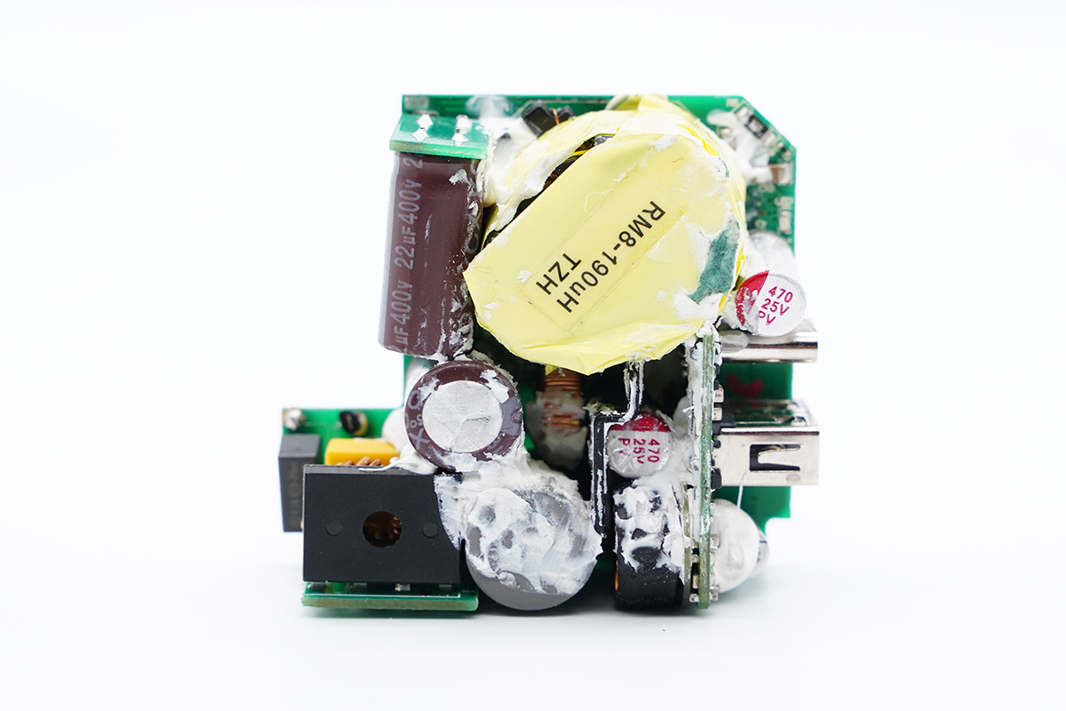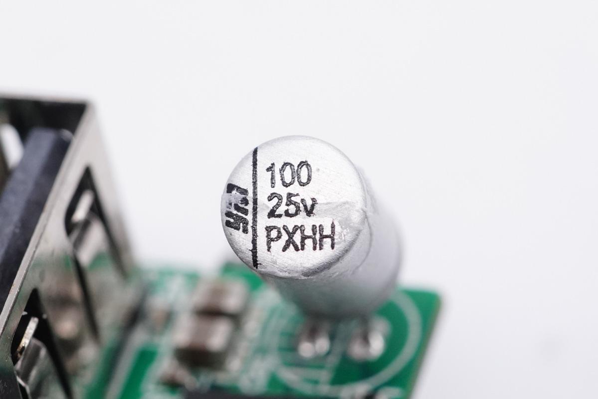 兩顆電容為永銘KCX系列。這是永銘2019年推出的快充電源專用產(chǎn)品,其工作溫度范圍在-55℃~105℃,3000小時(shí)壽命,并具備抗雷擊、低漏電流(低待機(jī)功耗)、高紋波電流、高頻低阻抗等性能優(yōu)勢(shì)。